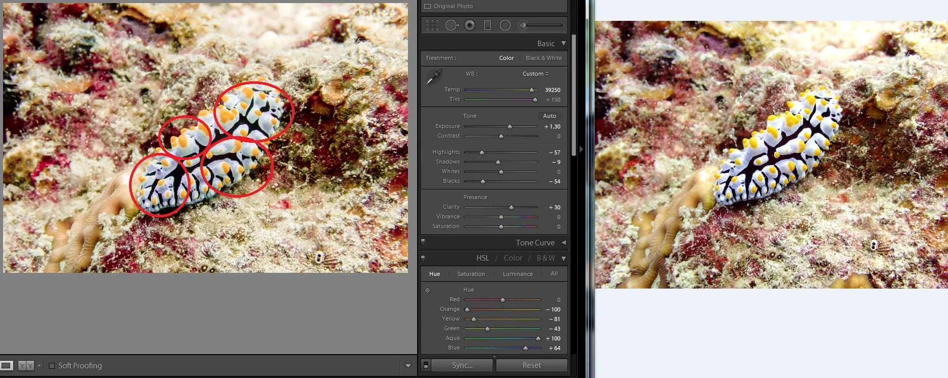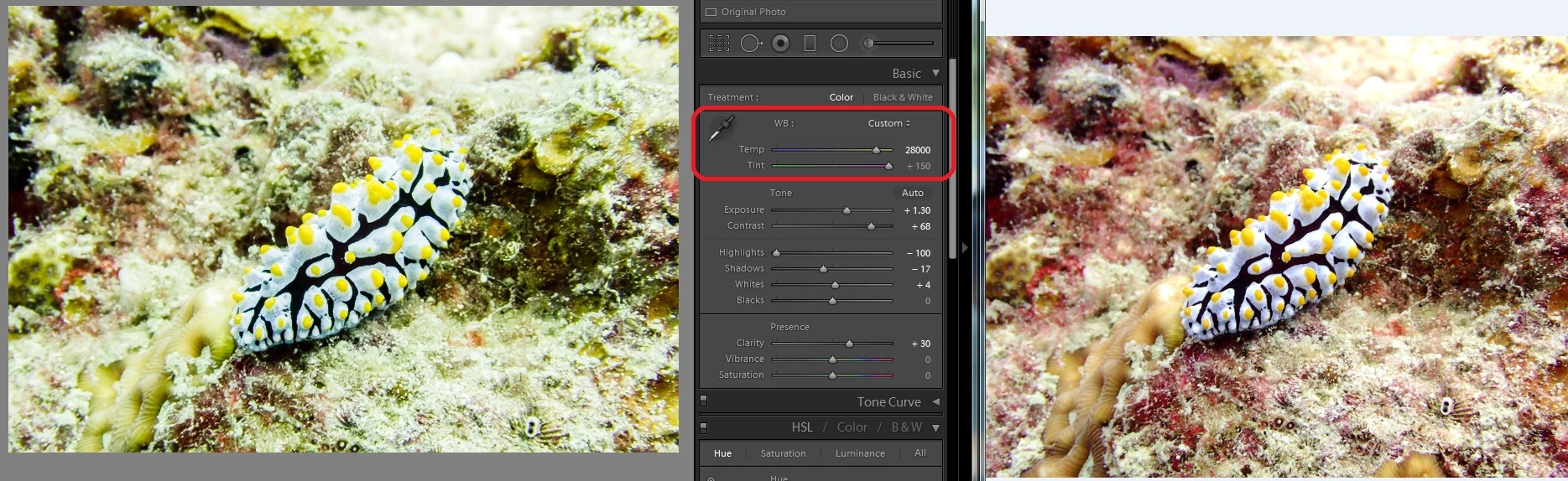 Lightroom white balance tint adjust limitation (underwater photo)