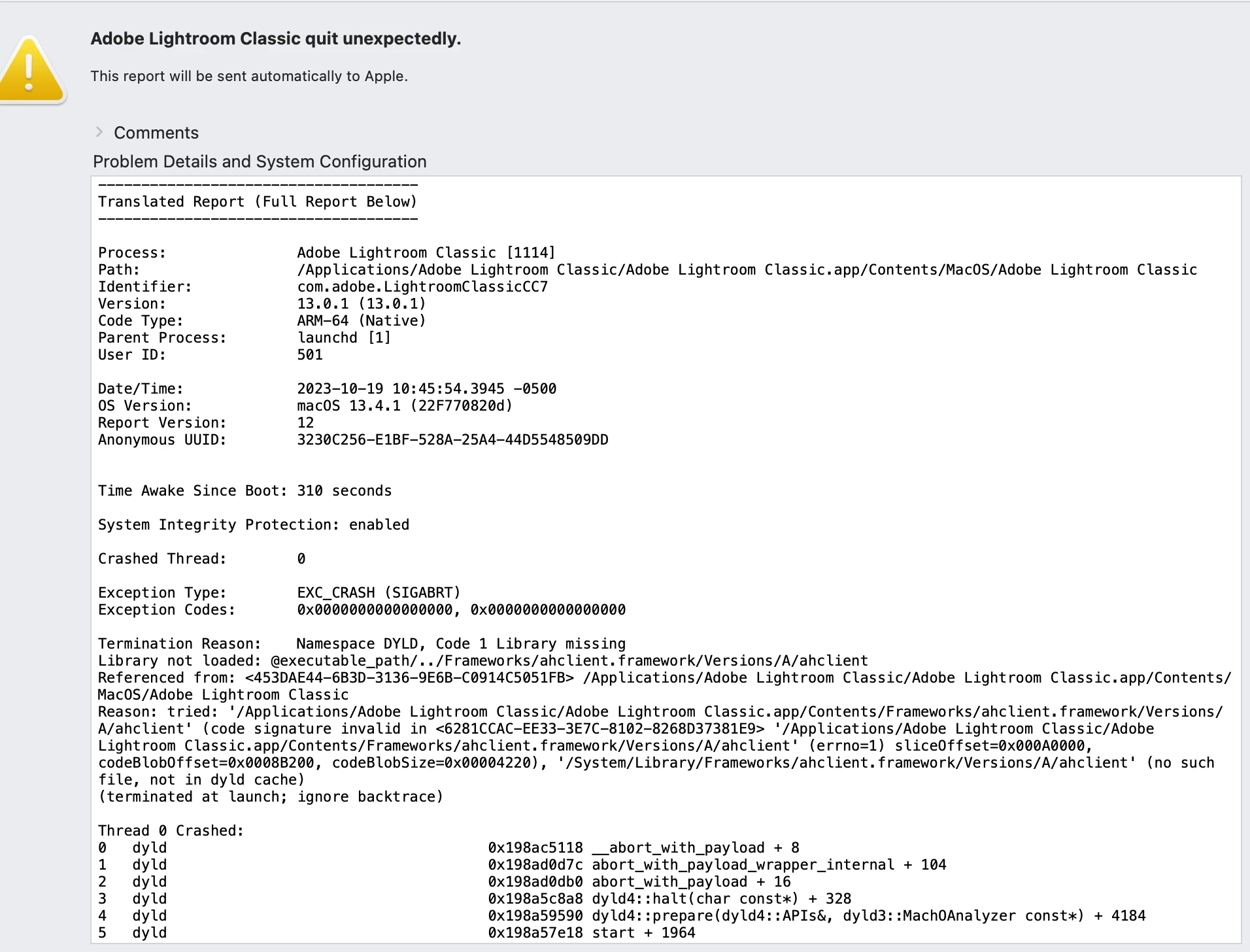 This is a known problem (a server issue) that has been resolved. Uninstalling and then reinstalling Lightroom Classic should therefore solve this. Reboot your computer after uninstalling. See full instructions here: https://community.adobe.com/t5/lightroom-classic-bugs/p-13-0-1-at-launch-lrc-quit-unexpectedly-mac/idi-p/14154780