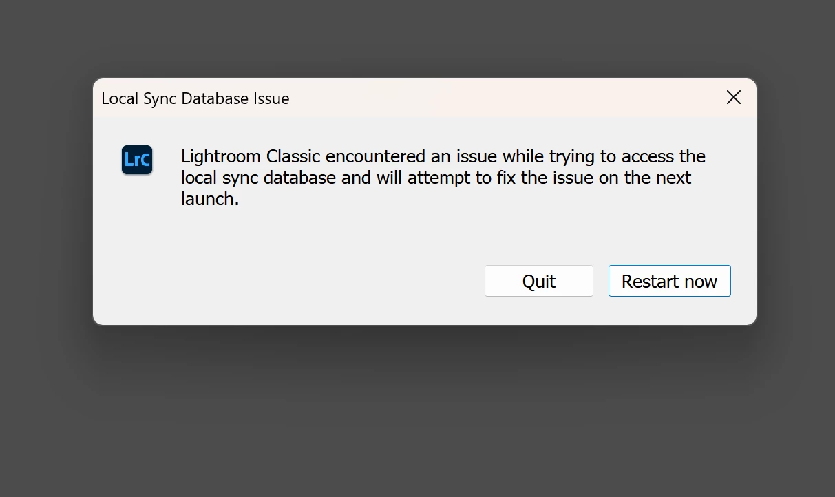 I set up LR classic to synch with LR CC and all worked fine. The computer crashed later on and now whenever I open up LR classic I get the sync error meessage (see below). I have tried uniinstalling restarting and reinstalling but to no avail. Any help would be greatly appreciated!