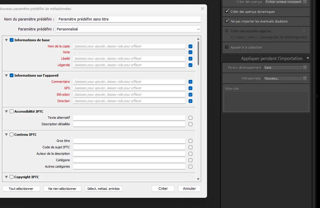 Lorsque j'importe dans lightrrom, je perds les données fournis par l'apprail tels que gps, marque, etc... j'ai vérifié les paramétres prédéfinis, aucune case n'est cochée. si je coche une case, je dois compléter le champ. Quelque chose m'échappe, mais je ne vois pas quoi. Les tutoriels que j'ai regardés n'abordent pas ce point.