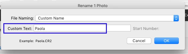 However, if you're asking a question about how to rename a file after import then this is done by choosing 'Rename Photo' from the Library menu. Note that you need to preselect the photos or photos to be renamed in advance. When 'Rename Photo' dialog opens choose 'Custom Name' from dropdown menu, then populate the custom field. The following two screenshots might explain these steps better.
