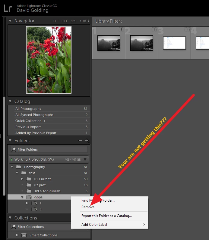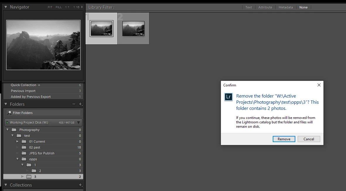 So got off my rear end. Turned on the PC, opened LR opened my test catalog, created a folder I called opps, created two folder in it, 1, and 3, in folder 1 created a folder 2, imported images into all three folders.All to test removing.