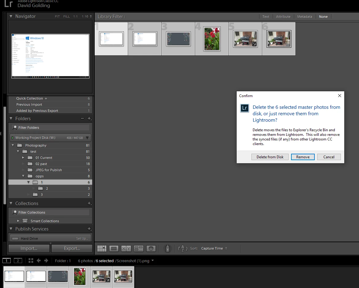 I select all the images in the filmstrip, I right clcik, choose Remove Photos (NOTICE THE DIFFERENCE, Remove Photos, not just Remove). I am presented with the Confirmation dialog you would expect asking Delete from Disk, Remove, or Cancel