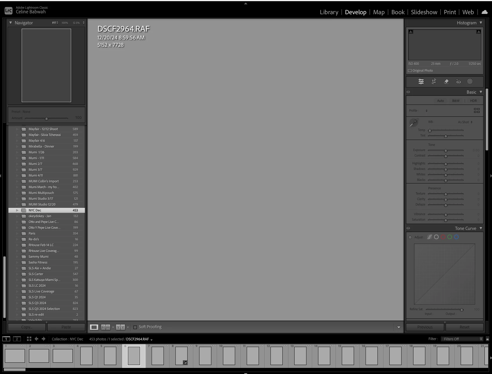 BUT, despite an image selected in the filmstrip, no preview in the navigation panel, no preview in the loupe panel, no previews in the filmstrip, and no data in the histogram, or curves. Both library previews and develop previews not showing up, and do data being sent to histogram, tone curves, and navigation.