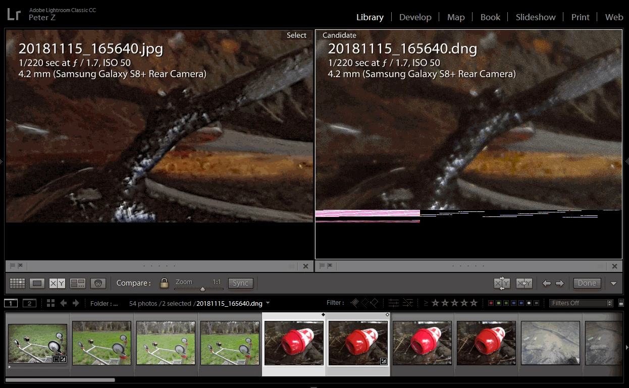 When I open the DNG in develop module, I notice the bottom 25 rows of pixels are corrupt/jumbled up with random colours. This happens on all of my S8+ RAW files when opened in LR. If I open the same DNG in a different viewer, such as XN View, the image is fine.