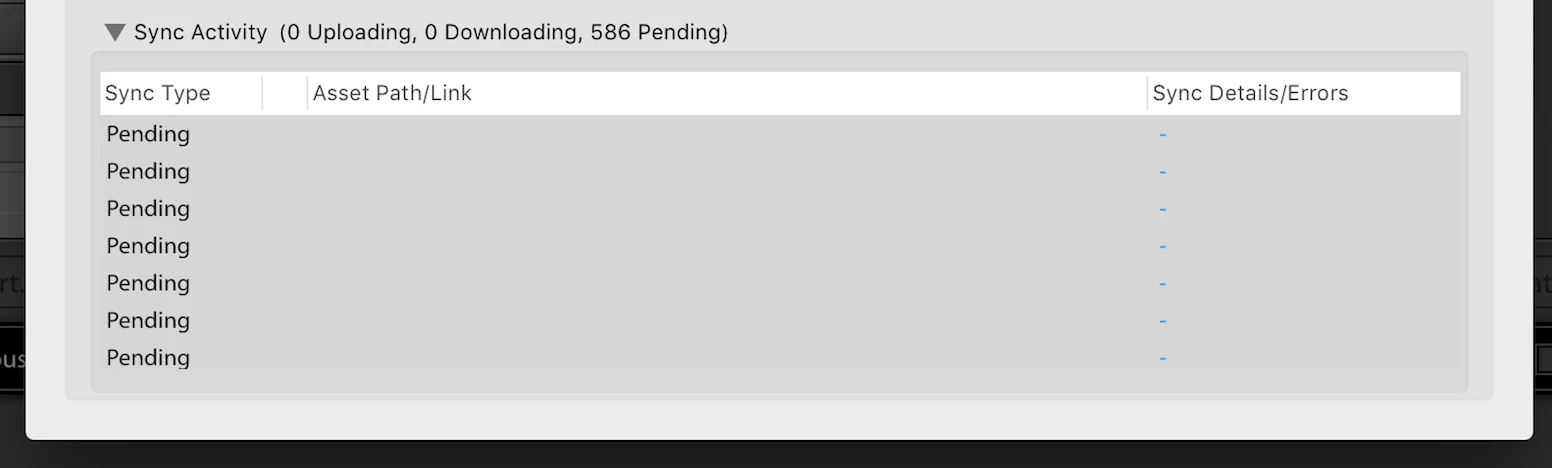 When I open the Lightroom mobile tab in Preferences, there is no 'Asset Path/Link' or 'Sync Detail/Error' information listed for each of the 'pending' files, so I have no way of knowing what or where they are. It doesn't appear to be getting in the way of syncing photos from desktop to mobile, but I'd like to get this fixed - whatever it is.