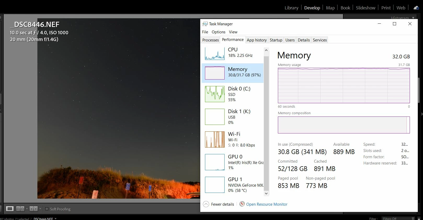 LRC, 13.5, ACR 16.5, on Windows 10, eats all memory, 32GB, on open
