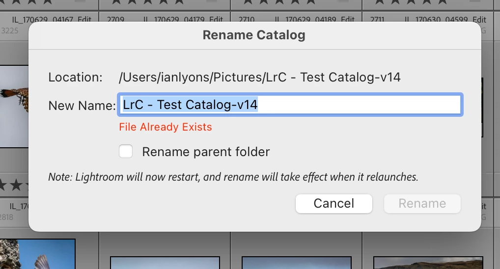 Since the release of LrC 14.0 last October, the catalog name is no longer updated to reflect the new version number.