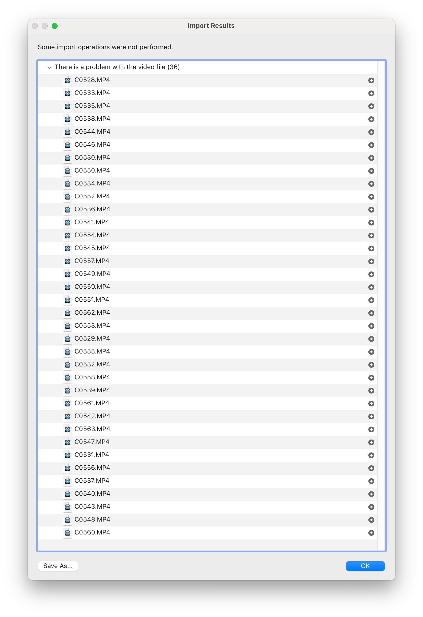 - As soon as the folder with the affected videos is selected in the Import panel, and it tries to render previews of them, if LrC was launched from a Terminal command line, a whole bunch of lines like the following are output, with the names of all the affected video files: