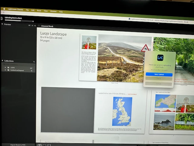 When I try to 'Send the book to Blurb'. It goes just over half way across in the top left 'Uploading Book to Blurb'. and then an error