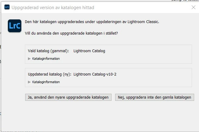 Every time I start LrC, through the exe file, I have a question asking me to upgrade the catalogue file or select another catalogue. Pls refer to attached picture (unfortunately in Swedish).