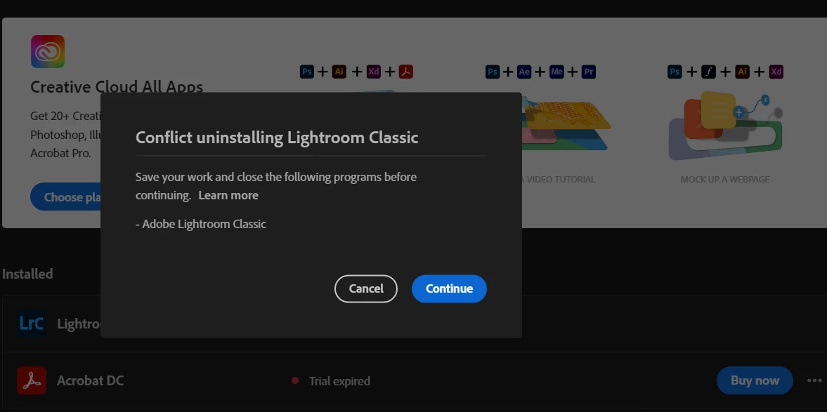- uninstalling with the Adobe Clean up program as per tutorial (will uninstall everything BUT Lightroom Classic)