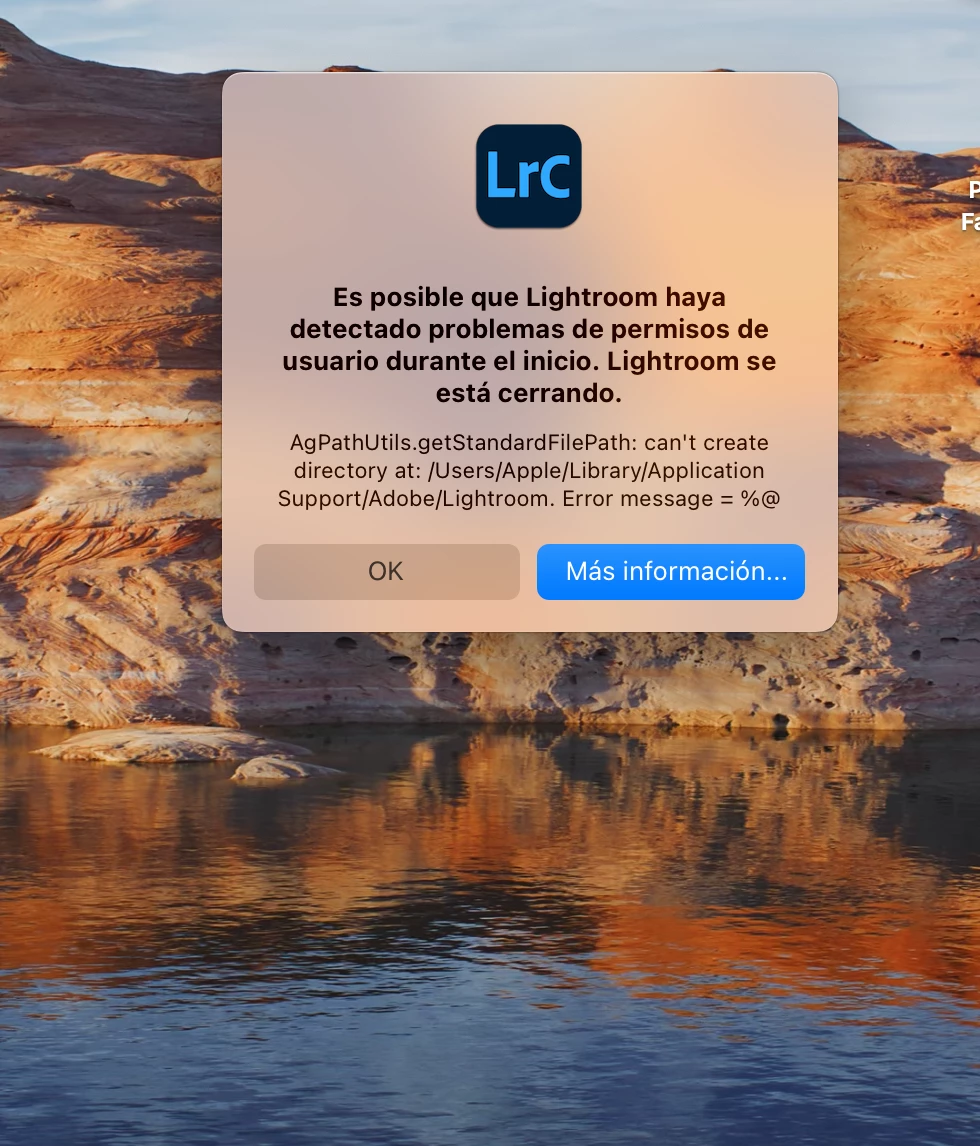Un saludo; registro este error al iniciar LrC Version: 13.1 (adjunto imagen con anuncio) , en MacBook M3 Pro (MacOS Soma 14.2.1), he desintalado el programa y vuelto a instalar y no permite ingresar. ¿cómo puedo solucionar el problema?