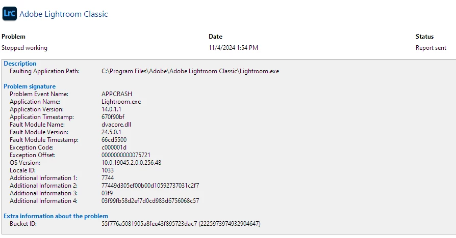 I have been troubleshooting this issue further and now believe the LrC app crash listing I see in the Windows Reliability Monitor is happening at startup each time I launch the latest version of LrC 14.0.1.1. As noted before, LrC does not create a Crash Report so further details are difficult to provide. Here are the relevant logs from my system...