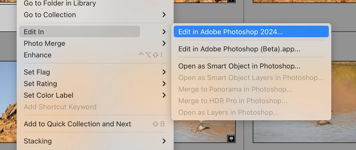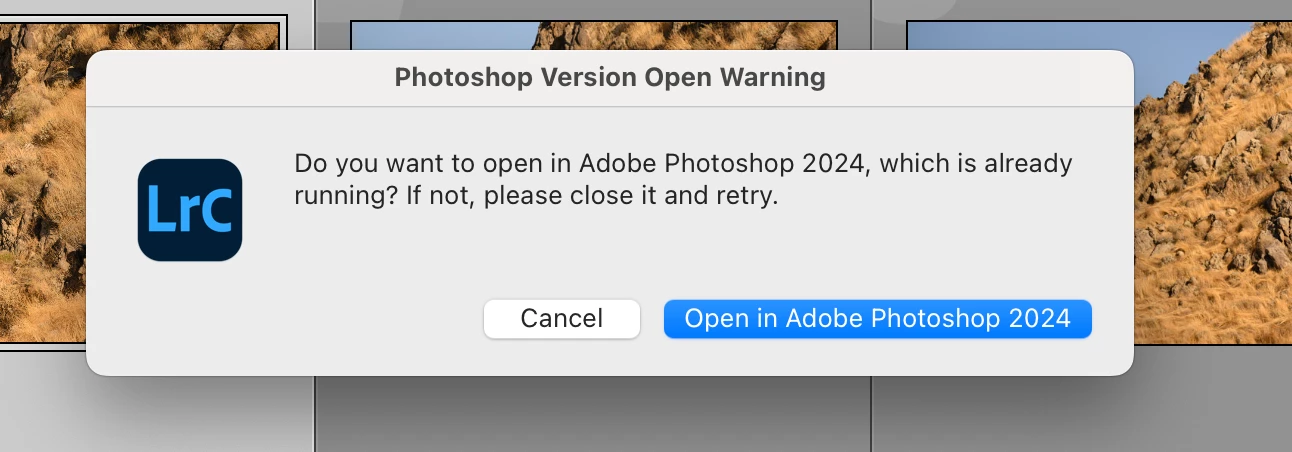 Photoshop 2024 definitely has been closed. The desired version of Photoshop is the Beta, not 2024 as shown in the screen shot. Clicking on "Open in Photoshop 2024" results in 2024 opening with the image from LrC. That is not the desired result when Edit in PS Beta was selected. The opposite happens if PS Beta had been running and PS 2024 was selected in Edit In.