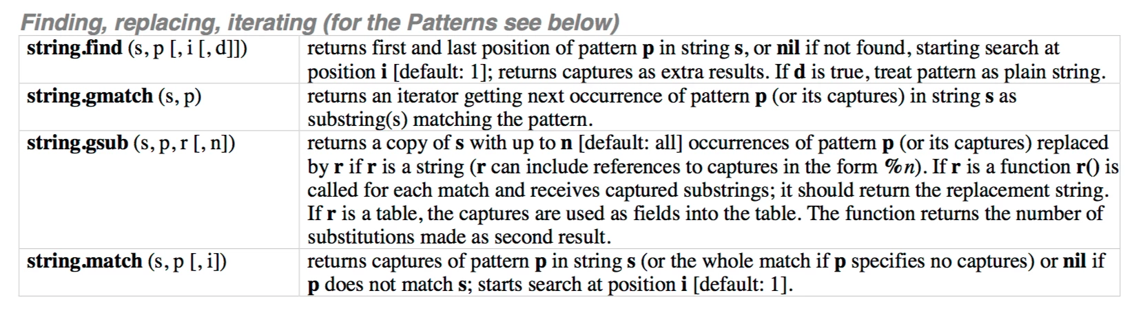 local example = "an example string" -- works as expected. for i in string.gmatch(example, "%S+") do Debug.logn(i) end -- tells me s is a function Debug.logn( string.gmatch( example, "%S+" ) ) -- tells me I'm trying to index a function value Debug.logn( s[1] )