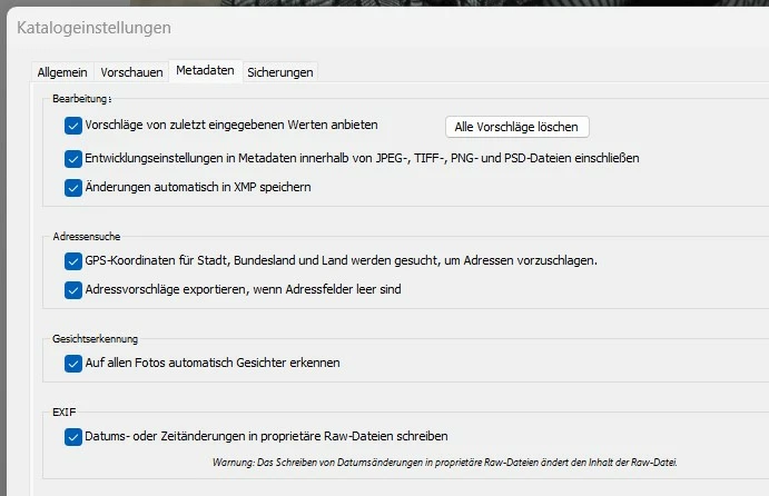 Für die Metadaten in den Katalogeinstellungen habe ich den Haken gesetzt bei