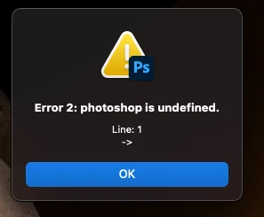 Step 5: Save file, no changes. (Error 2: photoshop is undefined.\n Line: 1 \n ->\n) (click OK)
