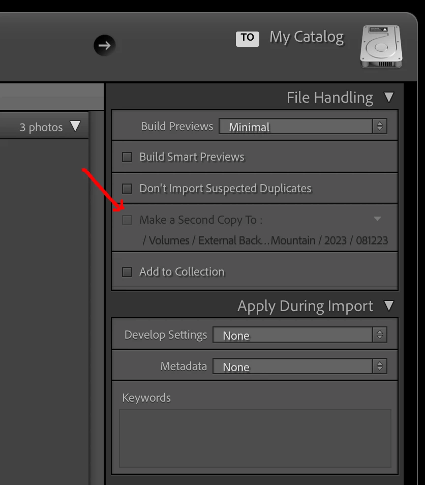 While preparing to import files to a New Catalog, the "Make a Second Copy To:" option is no longer (highlighted) working.