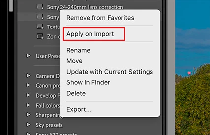 While importing, it is possible to choose a development setting (i.e. Sharpening, noise-reduction etc.) with you own custom name to automatically apply to all your imported pictures. However, each time you do an import, you always have to select this setting from all your presets. I see 3 options: