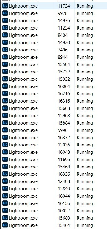 Every time I open lightroom, it eventually spawns dozens of lightroom.exe processes in Task Manager. My computer slows to a crawl, with 100% CPU. Closing lightroom does not rid of all the processes. I either have to End Task each manually, reboot the PC, or most recenlty am using PowerShell to close all at once.