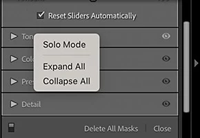 Quando usava alguma máscara (pincel, etc) no modo desenvolvimento, as opções de edição apareciam todas ao mesmo tempo (cor, tom, curvas) as abas ficavam todas abertas. Agora só aparece uma por vez, tenho que ficar clicando em cada aba para fazer os ajustes.