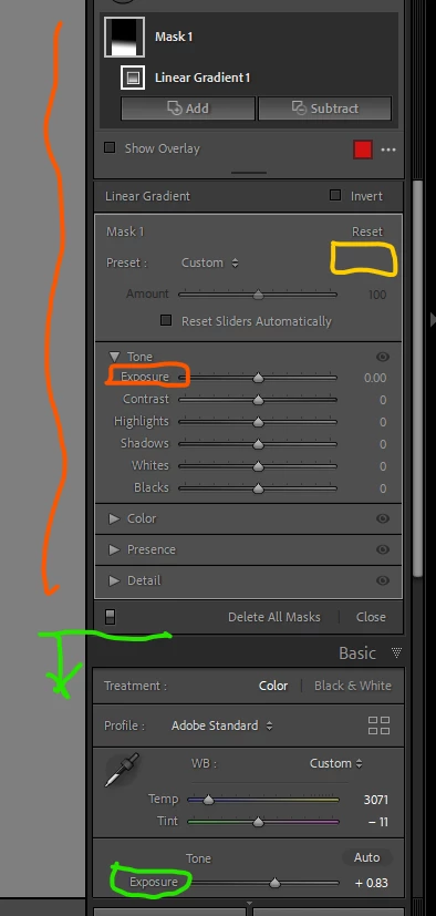 Ok. I pressed "O" and when I moved the "Exposure" slider, the whole image was brightened or darkened, whether I selected the Subject or Background. I did as you instructed and created a new mask for the Subject, and the whole image darkened or lightened when I moved the "Exposure" slider. It did the same thing when I created a new mask for the Background also. Now I really am confused.