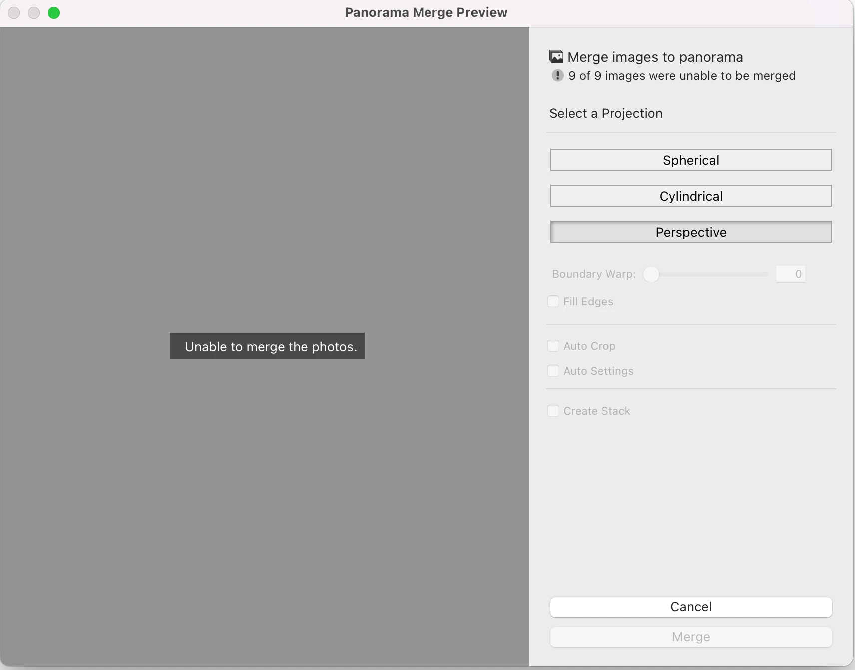 I shot panorama images in RAW (9 images total)  with the new Mavic 3 Classic and I'm unable to stitch them with the perspective mode in Lightroom 12.0.1.