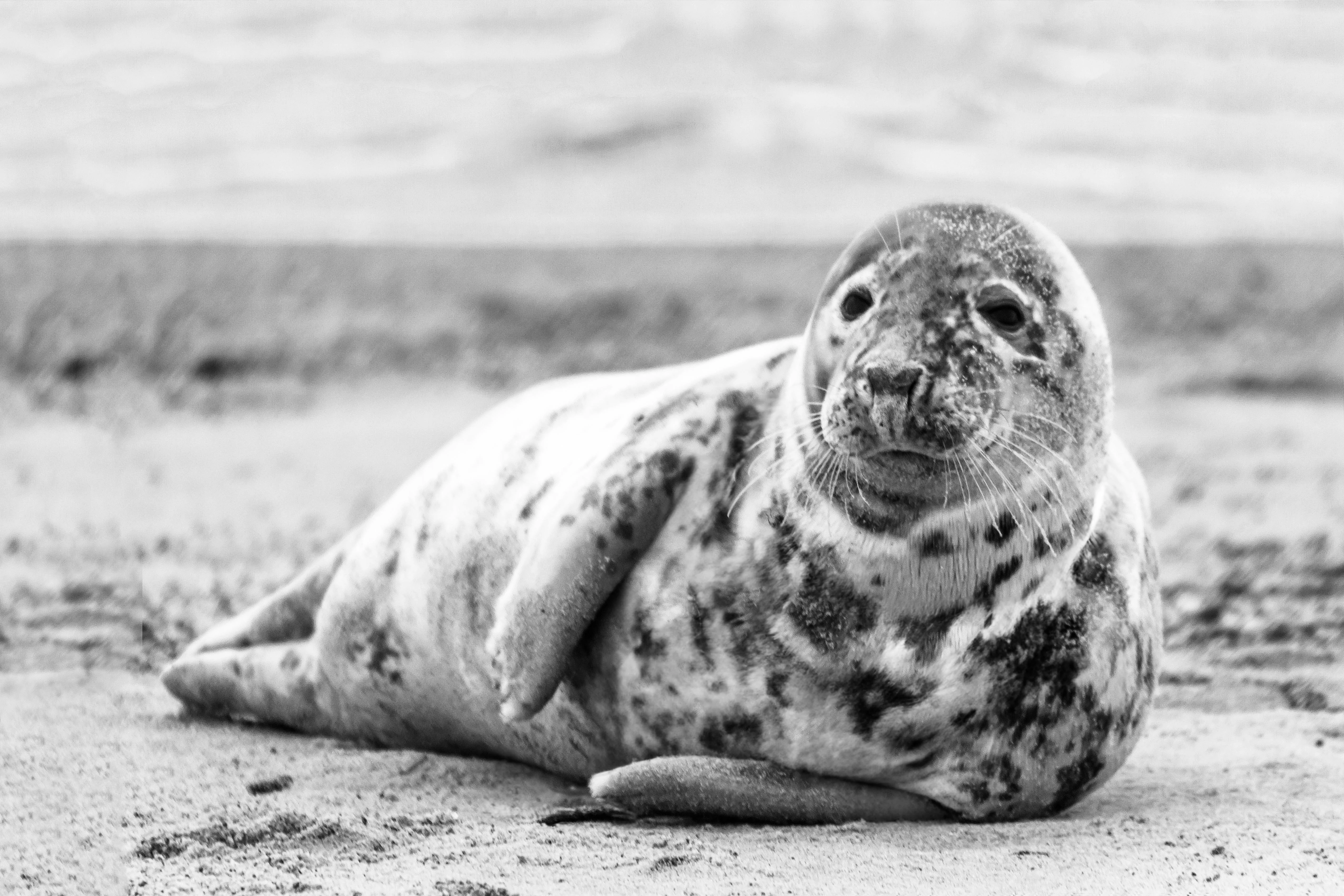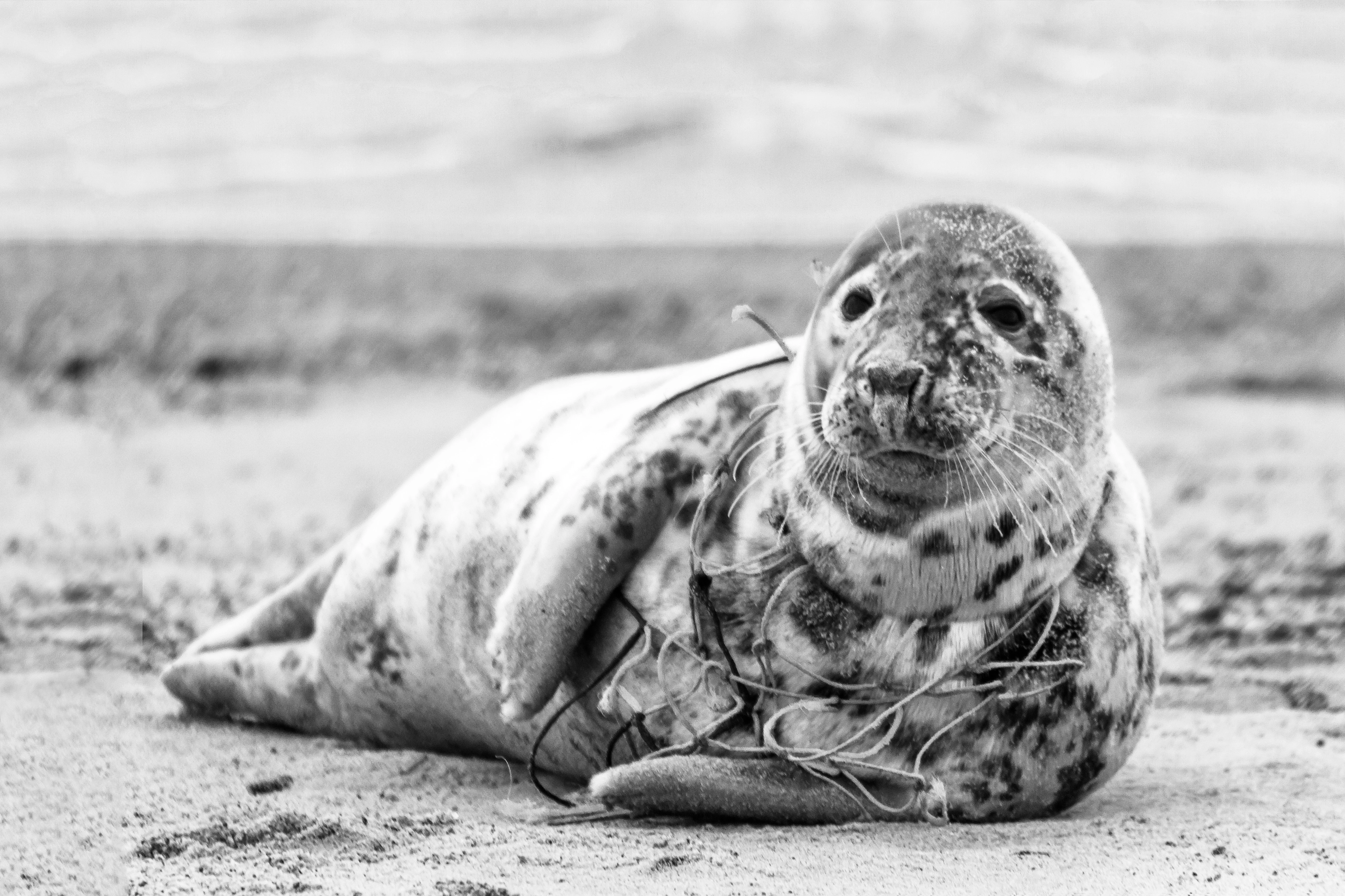 Picture of a Grey Seal at Horsey Beach in Norfolk England, tragically caught in a section of fishing net.