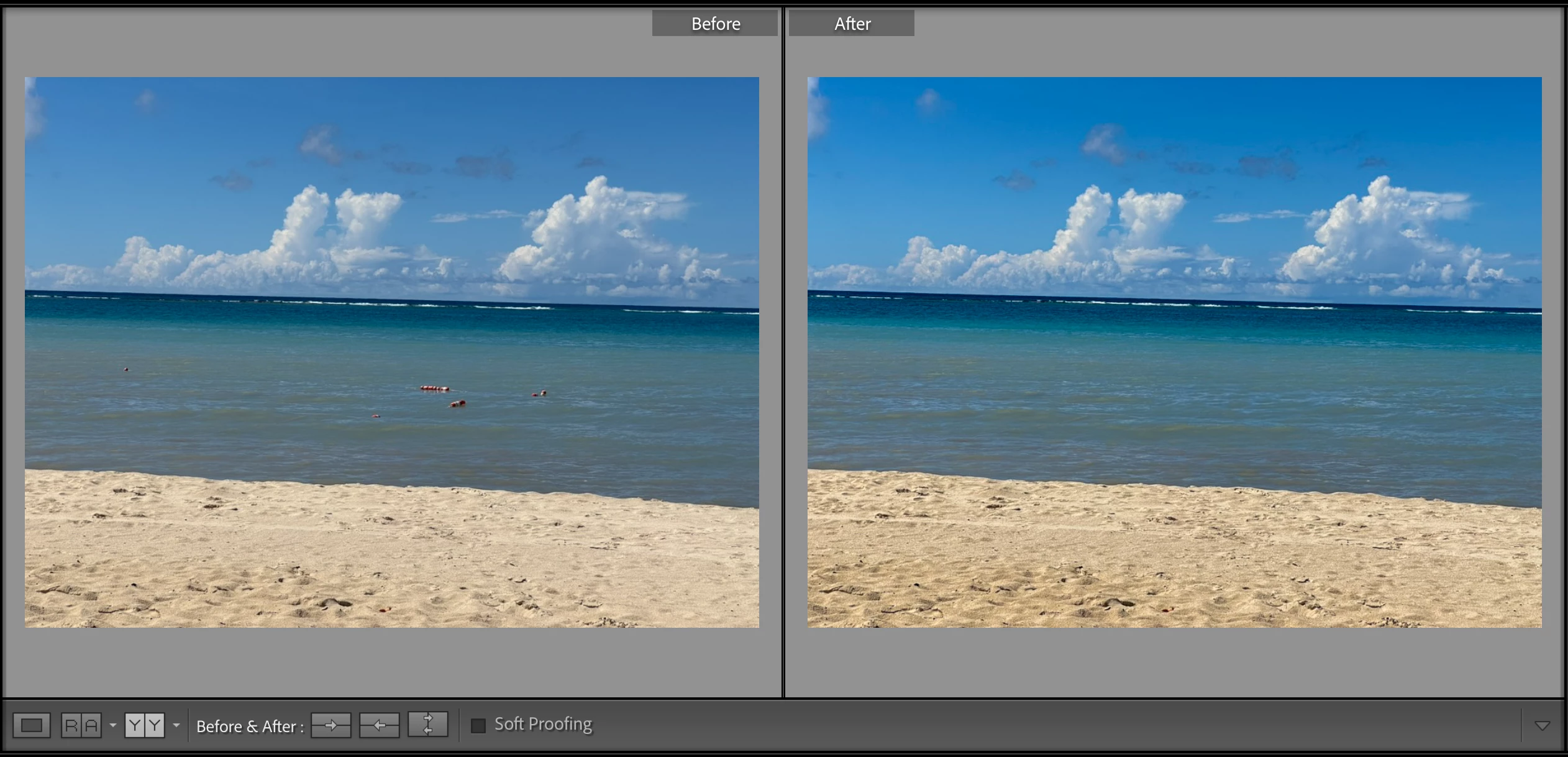 Using Adobe Firefly, Lightoom Classic removes the objects creating three different versions to choose from. You can cycle through the versions in the Selected panel, change the Opacity, Generate three new variations, or delete them and try again.