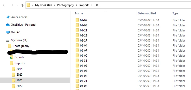 I save my photos from my camera to a 'YEAR' / 'MONTH-DAY' folder structure on an external HDD. As I copy them in, I import them into Lightroom Classic and tinker with them there.