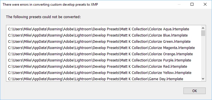 Specifically, 100% of the presets in this location are not able to be converted and are not showing up in LR Develop module: