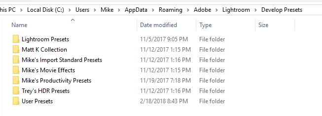 After latest update I can't find any folder of these: appdata, develop presets or user presets when I am trying to import my presets to Lightroom cc and I just don't know where these folders are. Is it possible I have delited them somehow? If so How can I get it back? I have imported presets to Lightroom cc before with no problems but now I am lost. Please advise what to do.