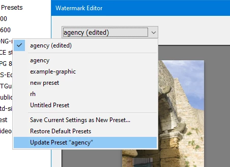 Here I made a change to a different watermark preset called "agency", and then chose the menu option highlighted in this second screenshot, which drops down from the selector titled "agency (edited)".