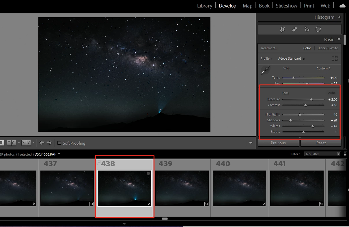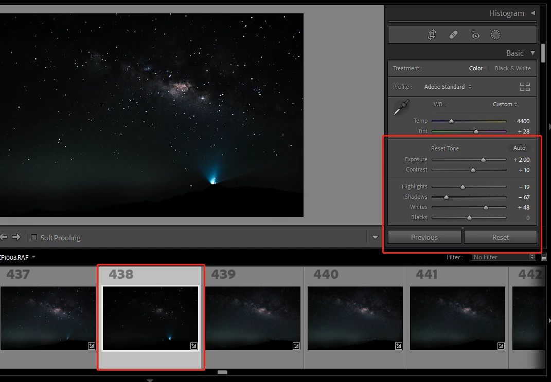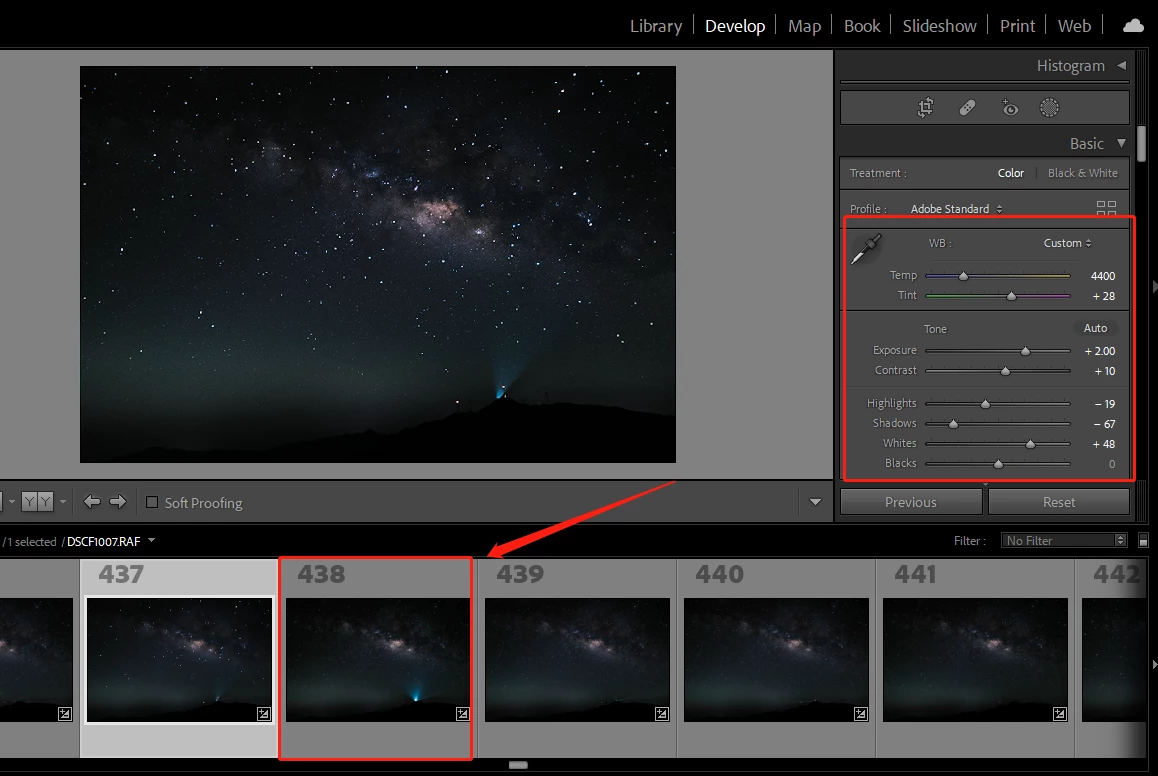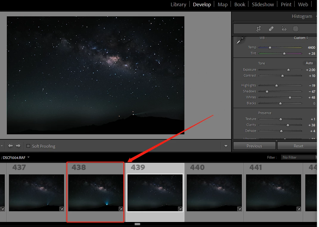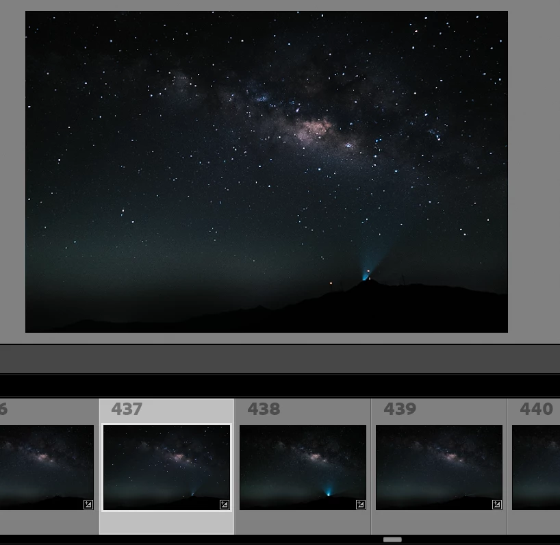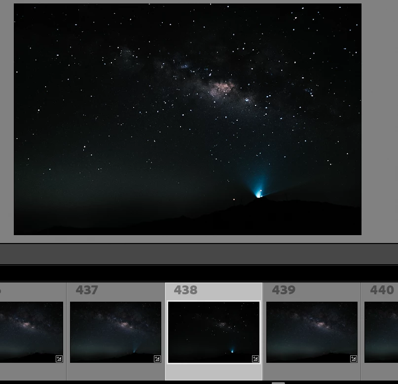 However when I click on the no.438 photo, it show entirly differnet colour and exposure as below screen captuure. and even I export it to JPEG, it also looks total different wha I want. And if I clicked back other photo expect no.437, the no.437 photo change to the one I expect (modifed as other photo in the thumbnail )