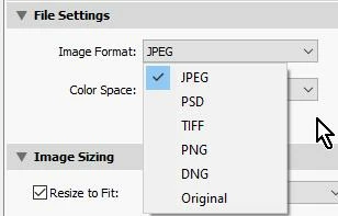 BINGO! That did it. I changed it to JPEG and then I got my drop down back for adding the watermark to export! I must have inadvertantly hit that little choice changing it to Original. I am so thankful you helped me get it reset!