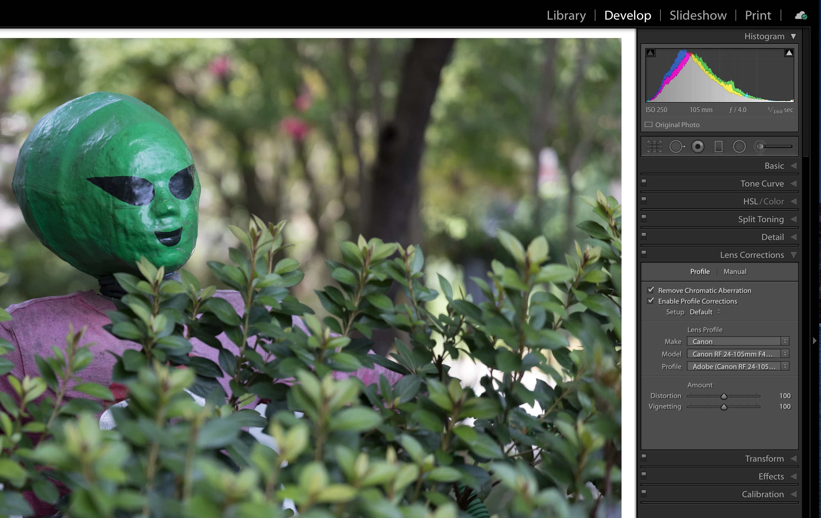 It’s likely to be added in another update, also I am not seeing anything unusual with the Adobe Standard profile. The lens is recognised and profile applied.