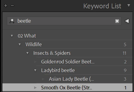 I am running version 12.4 of Lightroom. When I add a new Keyword to the Keyword list, I expect it to appear in the autofill list when I move to a different photo. It does not. It shows in the Keyword list if I search, but it does not appear in the Keyword dropdown when I begin nto type. See example below for Smooth Ox Beetle. I had this problem in the past, but an update corrected it. It seems that the old problem has resurfaced.