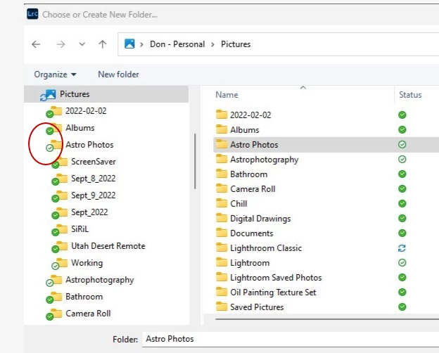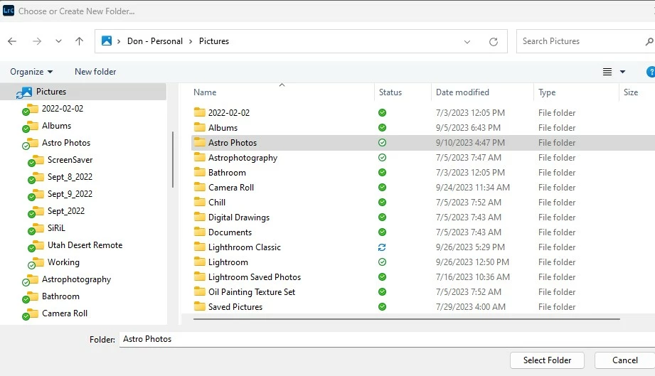 I am a total newbie to Lightroom. I got it with my Photoshop subscription and have what I hope is a fixable problem. My version is 12.5, I am using Windows 11 on a new PC. I have abut 18,000 photos in my Pictures folder in dozens of subfolders and subfolders within the subfolders. I set up my library by telling :ightroom to include Pictures and all subfolders. It got about 80% but failed to include several key subfolders. It shows the first two subfolders, skips the next 9 subfolders, and then pisks up the last 4 subfolders. It happens to miss the Astro Photos folder which is all I really want to work on. 🙂 I tried clicking on the + icon next to folders and selected "add folder" which takes me to the file explorer view. There I selected the Astro Photos folder and clicked on the "select Folder" button. Then the file explorer disappeared and nothing happened in Lightroom. I have attached photos of the library folders and the select folder view.