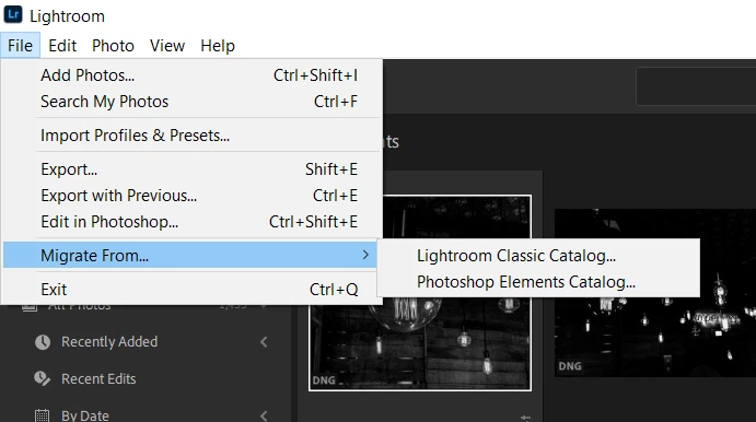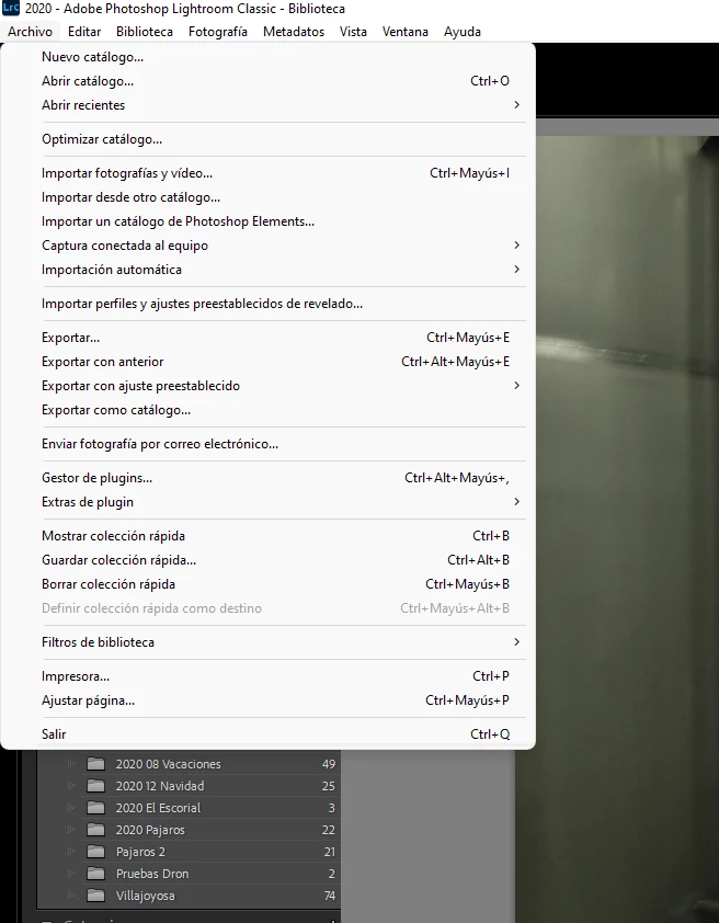 Estoy utilizando la versión 11.3.1 de Lightroom Classic. Quiero migrar un catálogo a Lightroom y no aparece la opción en el menu Archivo.