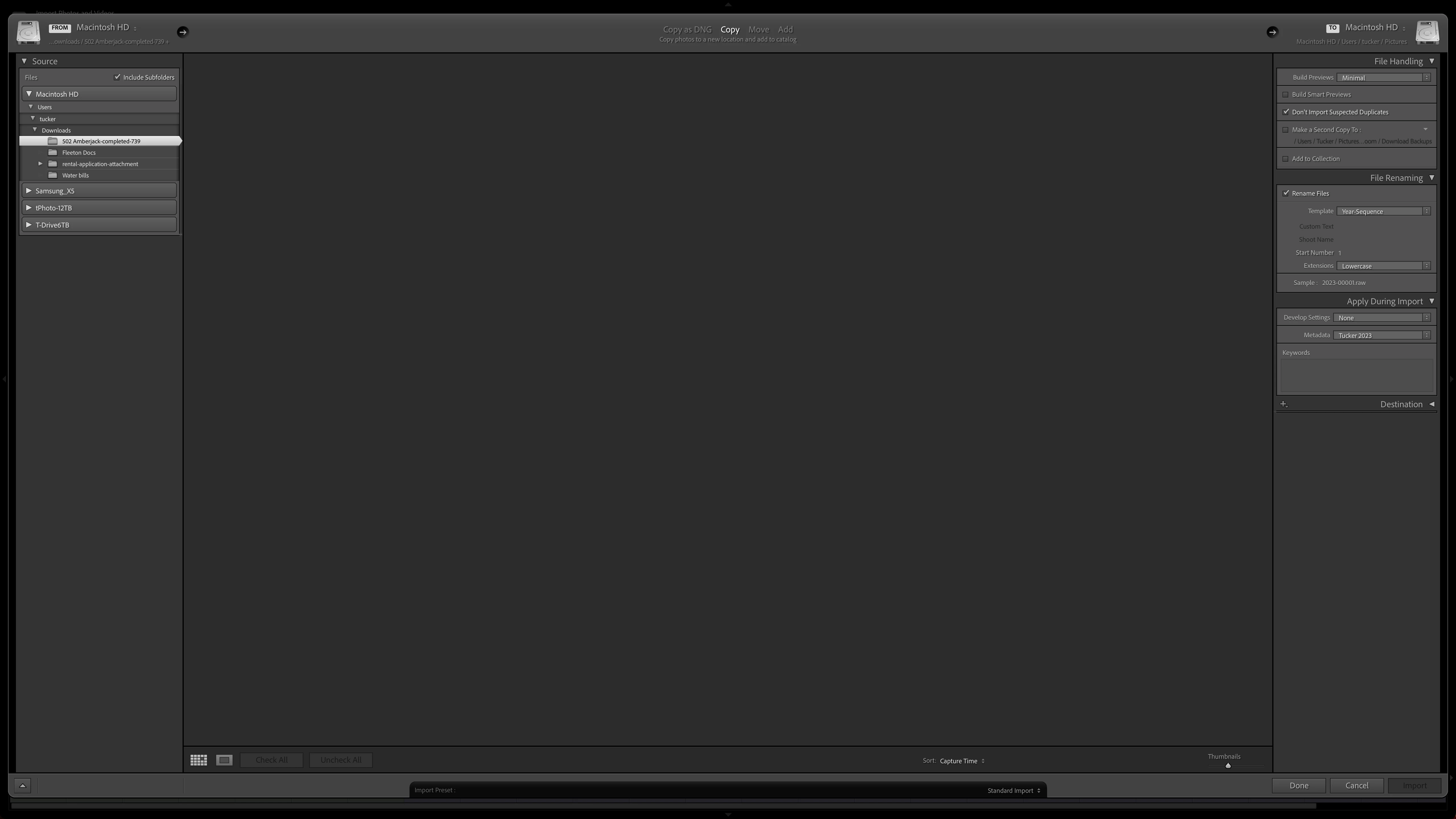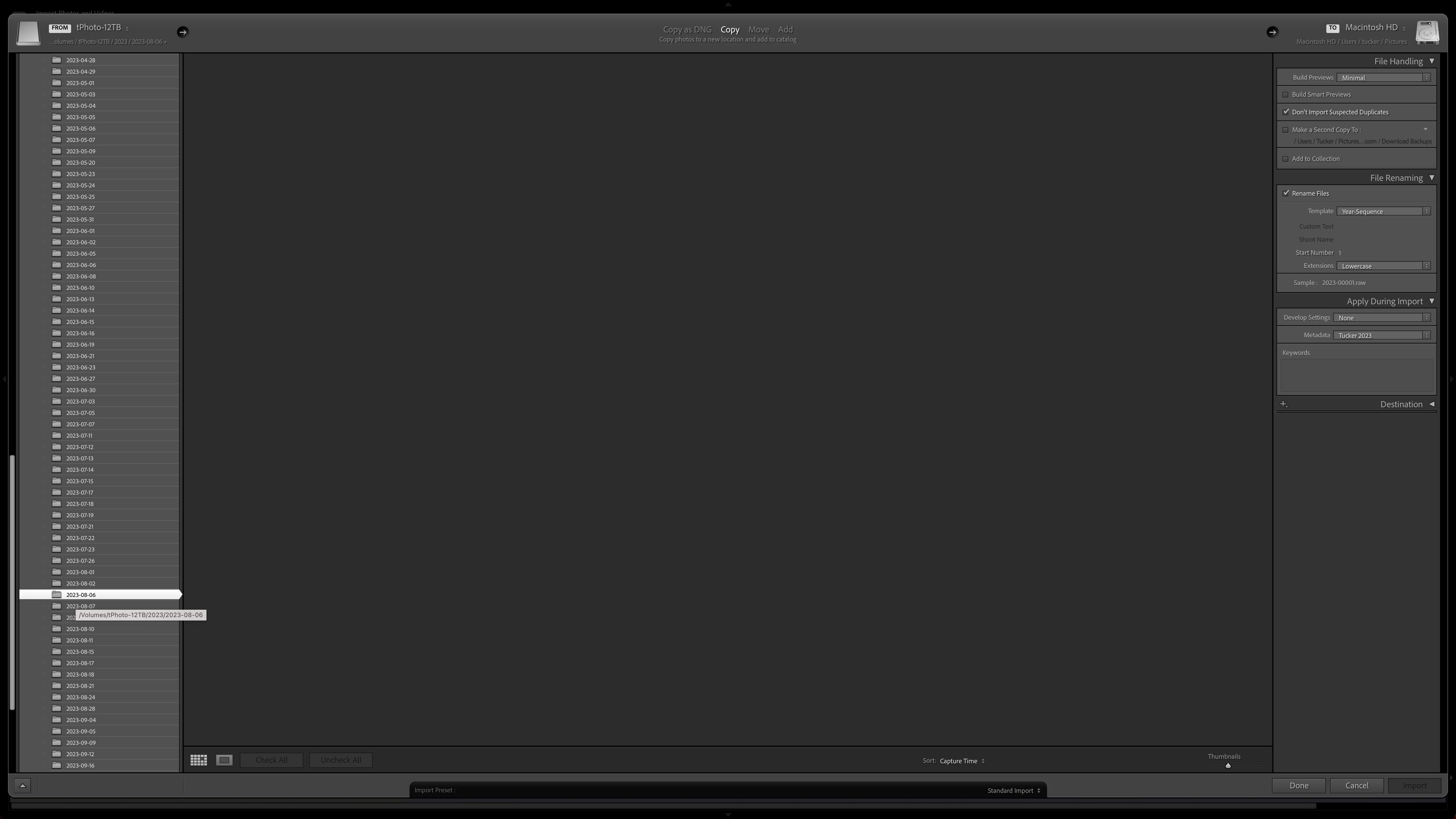 Navigating to other folders makes no difference. Every one of these folders is full of images in various formats. No image comes up, no matter which folder I select. I've tried tinkering with every setting I can think to try in the import window, and nothing gets Lightroom Classic to see the images that are on the disk.