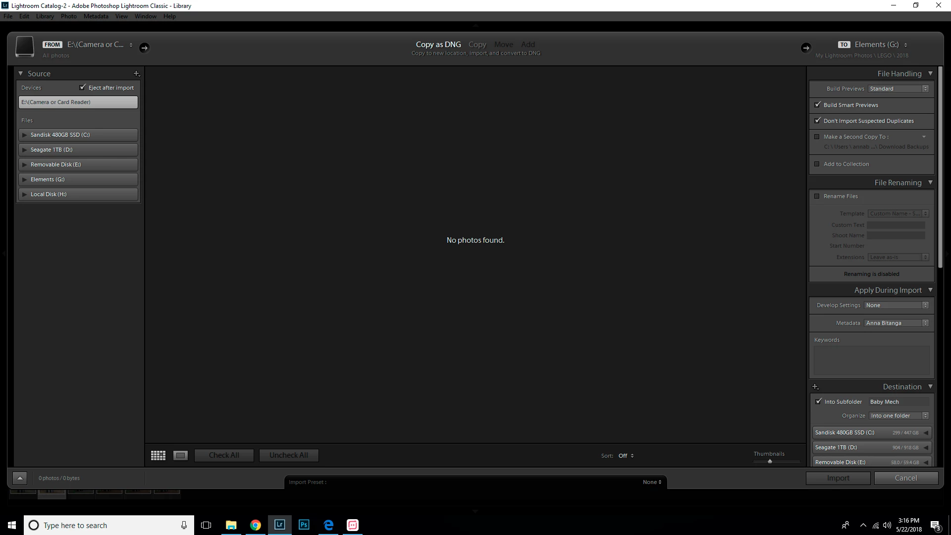 Recently and suddenly, LR 7.3.1 tells me "No photos found" on any SD cards I insert into the card reader. The cards are read just fine by Windows 10 64-bit (drive E in the attached screenshot). I can also review all of the photos on the cards from my camera.