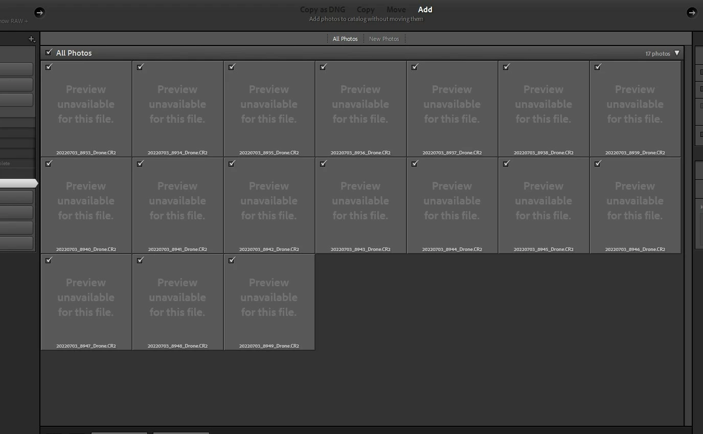 I see that you placed the photos on a cloud storage, specifically OneDrive. Wondering if a connectivity issue is occurring. Also, wondering if their is a file permission issue going on between LrC and your OneDrive. What happens if you place them on an actual hard drive in or connected to your computer?