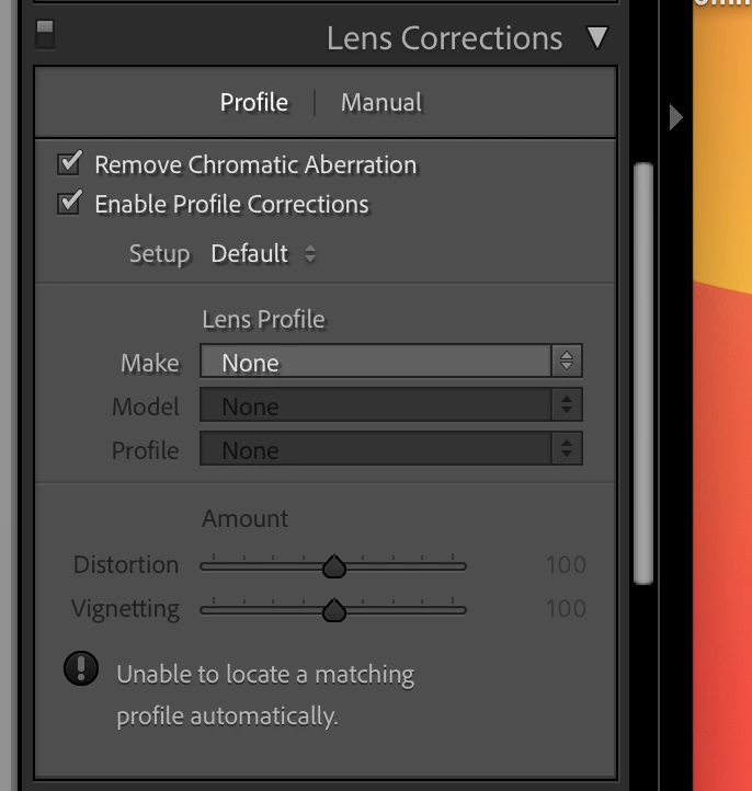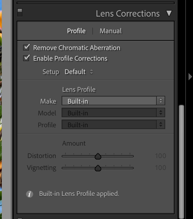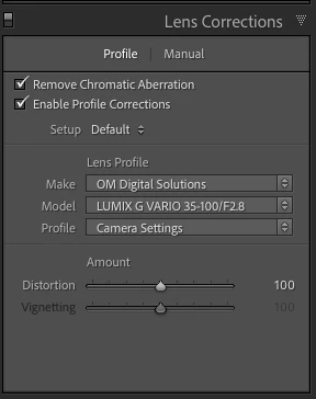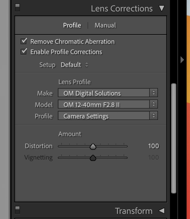 I've been editing photos made using my new OMS OM-1 camera. In one of the photos I noticed the horizon had a "dip" in it. I've not noticed this in other photos from other Olympus cameras I own (EM-1 Mark 2 for instance) using the same lens (12-40 mm f 2.8). I thought this was odd so I tried to correct it using the Distortion slider in the Manual tab of the Lens Correction panel. That helped but I would need to crop the image afterward. I undid the change and went to the Profile tab of the Lens Corection Panel. To my surprise, checking "Enable Profile Corrections" actually made a difference to the image. I was surprised by this since with my older Olympus cameras checking "Enable Profile Corrections" isn't needed as the lens profile of m4/3 cameras are automatically applied.