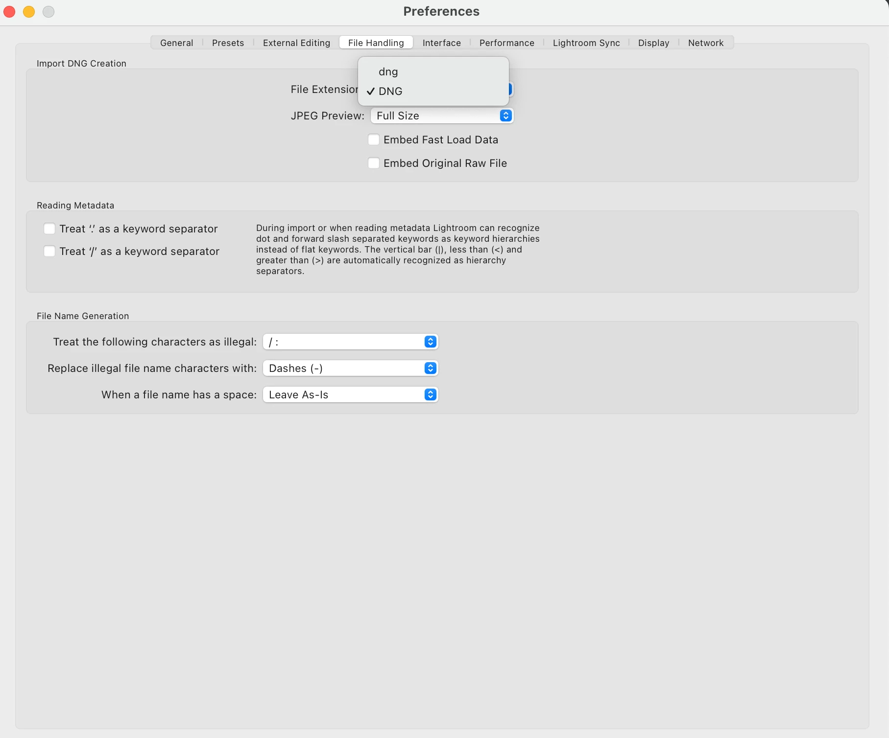 I am using Lightroom Classic on the new Mackbook Air M2. I am trying to complete the "Preferences" for importing photos. Under "File Handling" the for option is "Import DNG Creation" the only File Extension available to choose from is "DNG" or "dng". Below that is a "JPEG Preview" option.