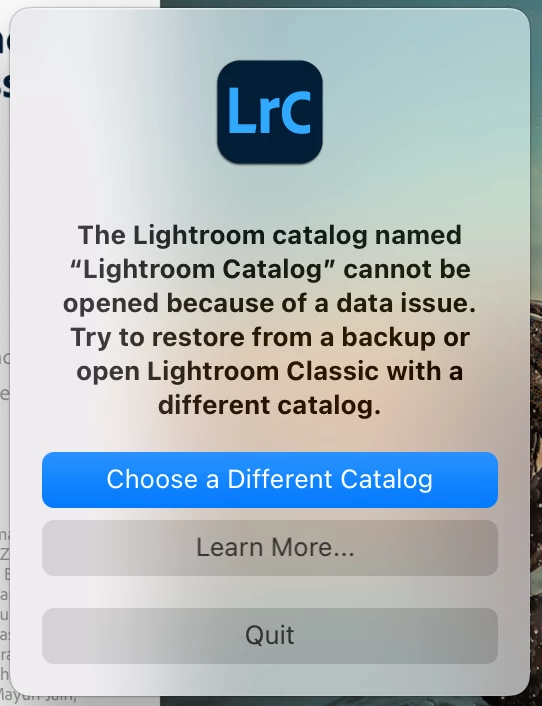 " The Lightroom catalog named “Lightroom Catalog” cannot be opened because of a data issue. Try to restore from a backup or open Lightroom Classic with a different catalog." (see picture)