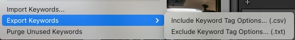 LR 12.2 tweaked the Metadata > Export Keywords command to export in two formats, .csv and .txt: