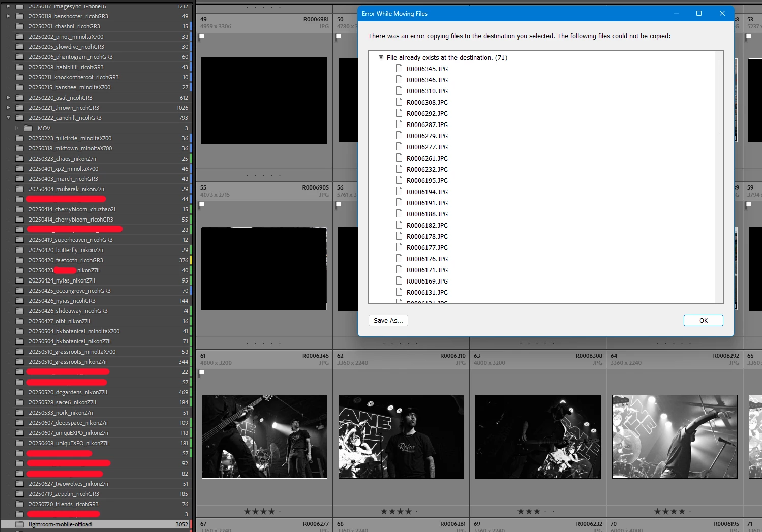 Now here’s where the fun begins. I have a bunch of folders from each shooting event with the RAW+JPG, flagged, unflagged, and rejected—about 100 folders or so. I want to move the edited JPGs that were copied from the cloud (Lightroom Mobile) into the original ingest folders. However, when I try to do so, I get the good ol' “file already exists at the destination” warning. I want to be able to overwrite those JPGs if possible, but I don’t think that option exists.