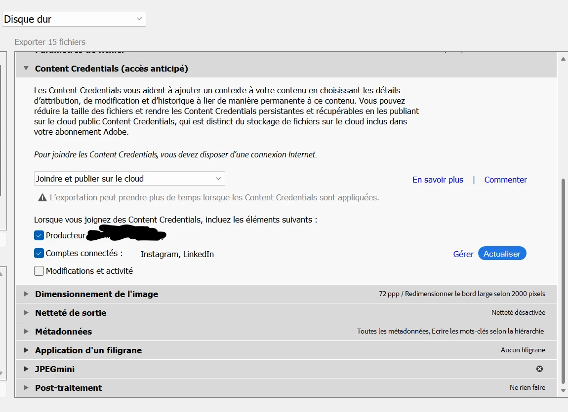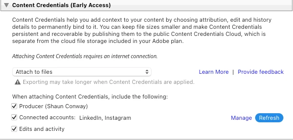 It would be nice to be able to select/deselect the connected accounts you would like to include in your content credential in Lightroom Classic.  Currently, it's either all the connected accounts or none of them.
