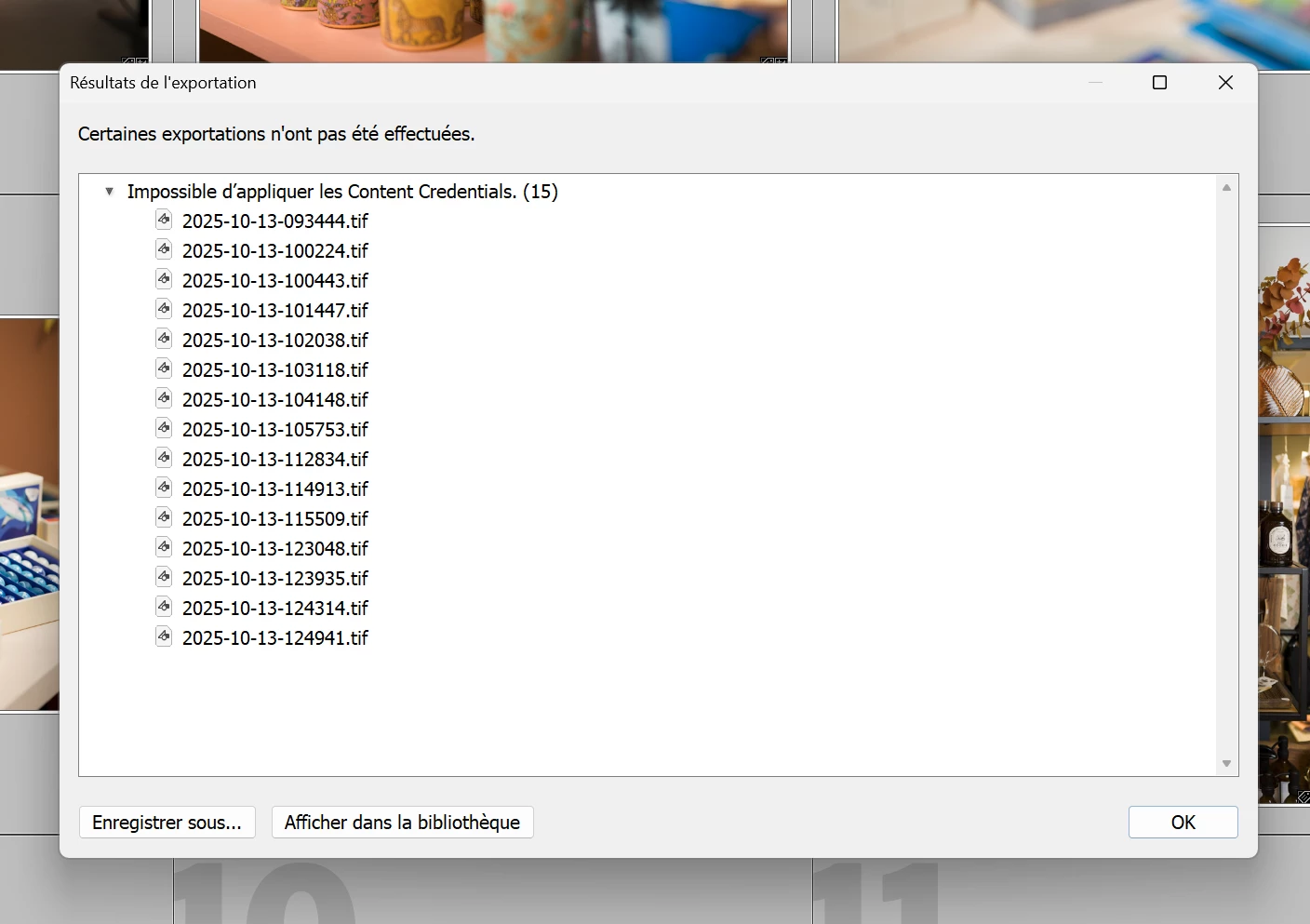 Hi, CC worked in the previous versions of Lightroom, but since version 14.4 (202506051112-5918896a) it's no longer working : I can't export with CC anymore, if I check CC box while exporting, I get an error message "Some exports were not completed: unable to apply CCs" and all my files are not exported.